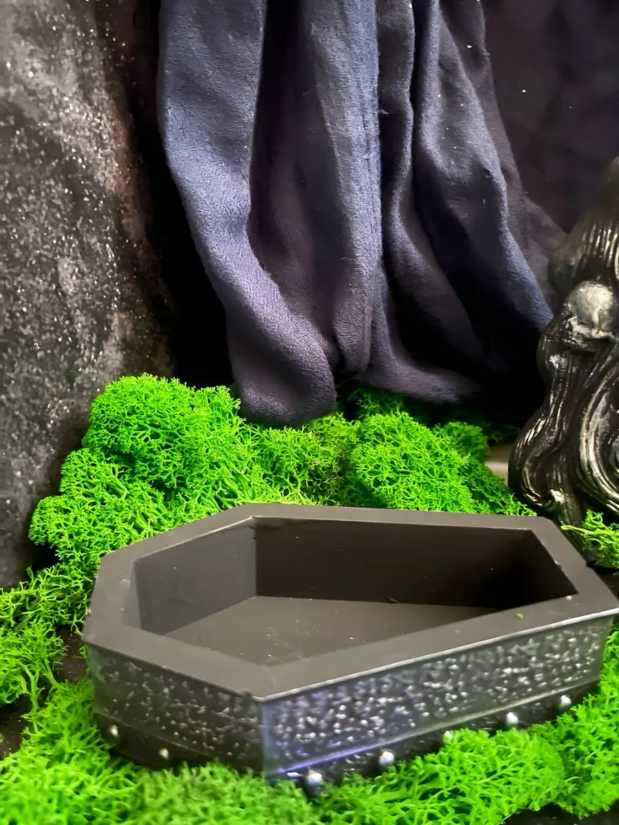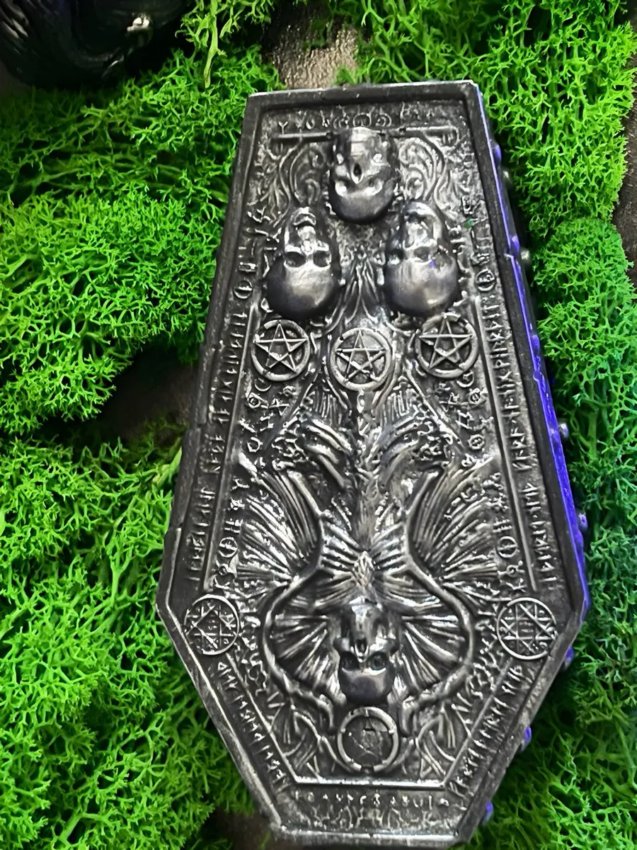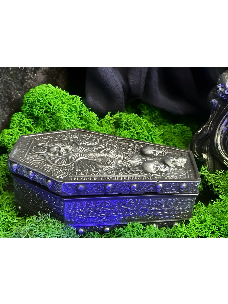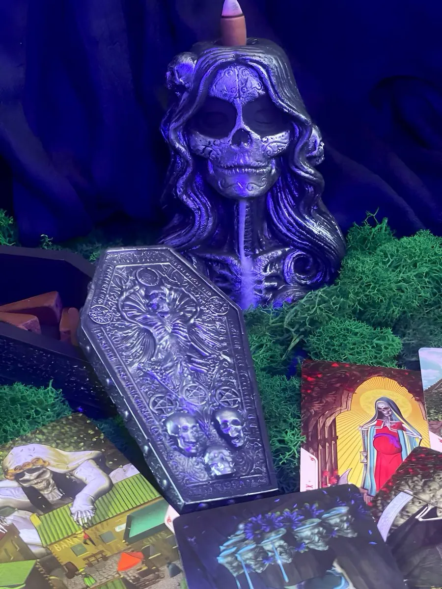 Статуэтка Санта Муэртэ, служащая держателем для благовоний. Шкатулка для благовоний-конусов в форме гроба с изящными деталями. Яркий антураж, вдохновлённый мексиканской культурой почитания Святой Смерти.