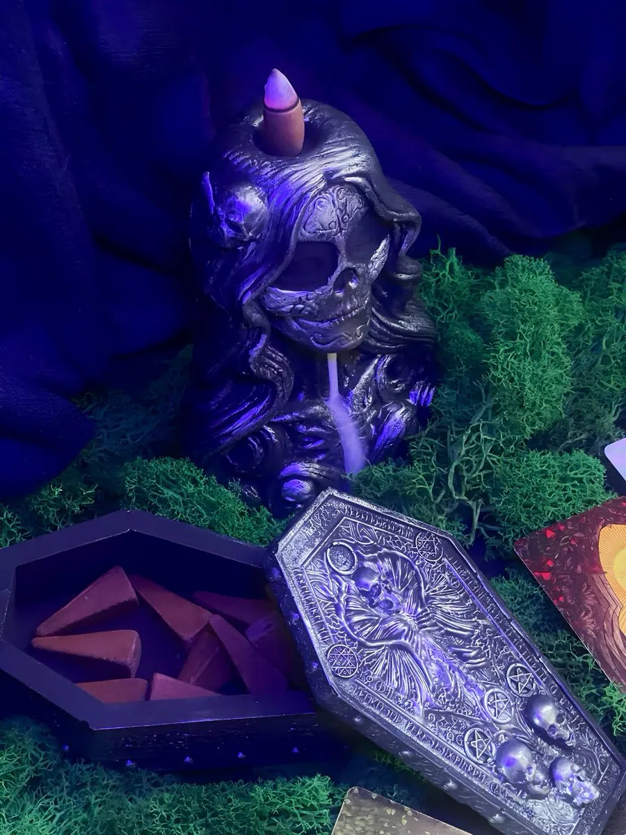 Этот набор станет идеальным спутником для медитаций, ритуалов и проработки энергии трансформации и духовных переходов. Подходит как для личного использования, так и в качестве атмосферного декора для вашего уголка силы. Дарите почтение и соединяйтесь с миром предков и духами через символику и ароматы благовоний.