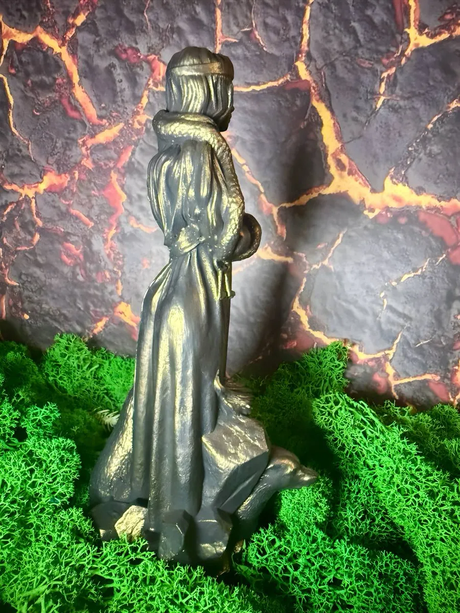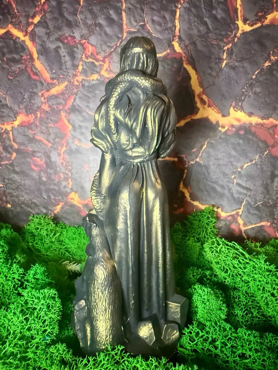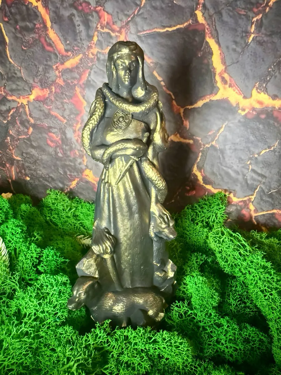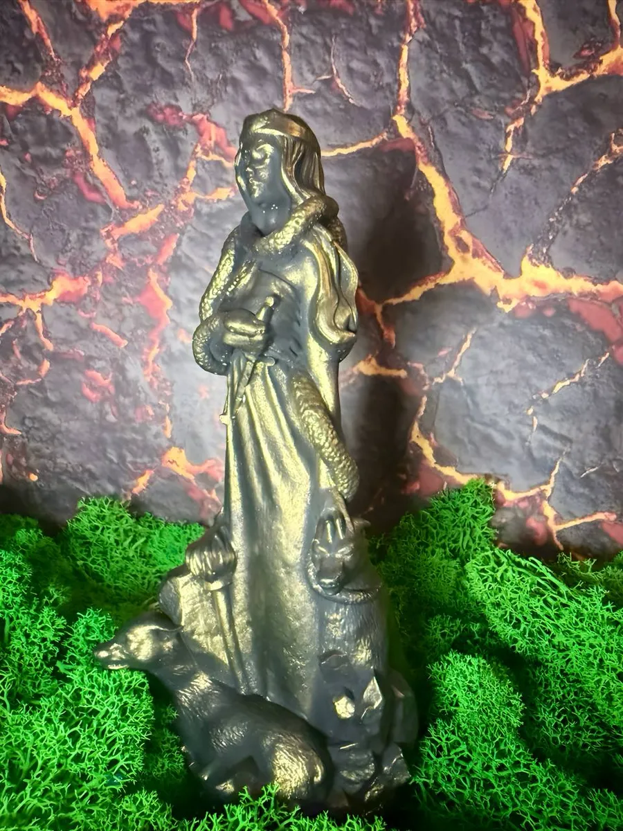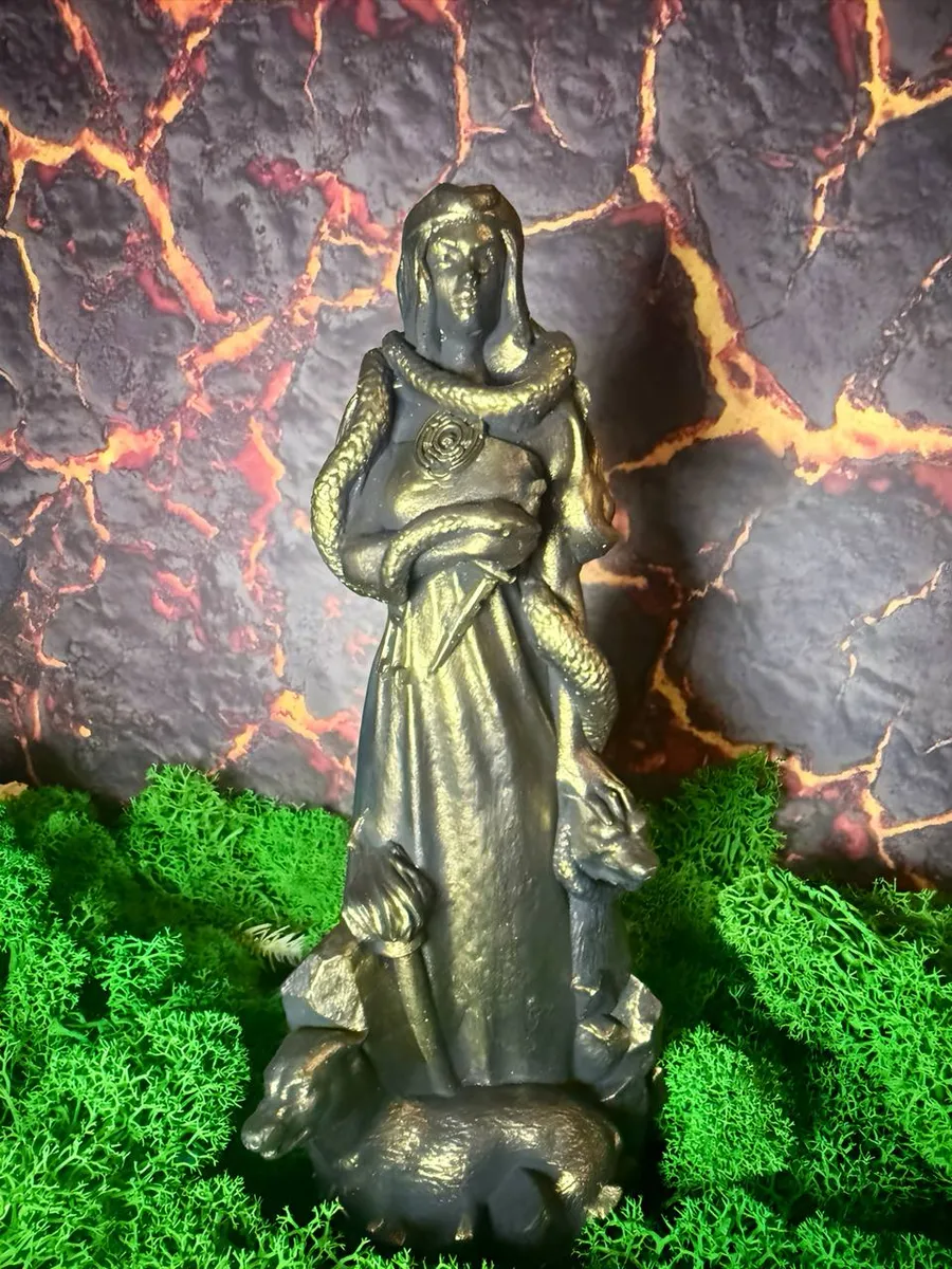 Статуэтка «Богиня Геката» — изысканный аксессуар для оформления алтаря, уголка силы или современного интерьера. Геката — древнегреческая богиня магии, перекрёстков, тайн и луны. Она считается покровительницей ведьм и защитницей от зла, символизирует мудрость, интуицию и силу перемен.